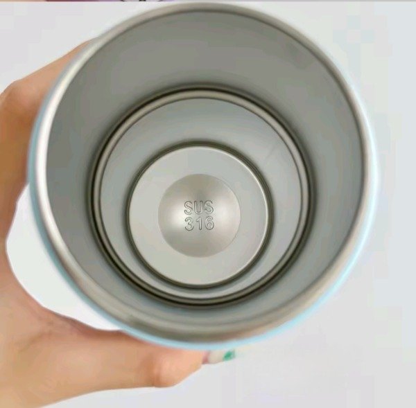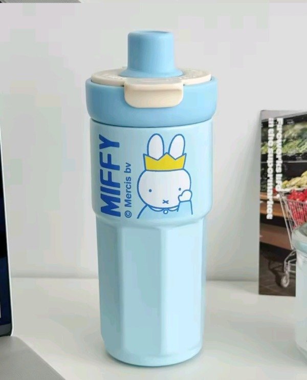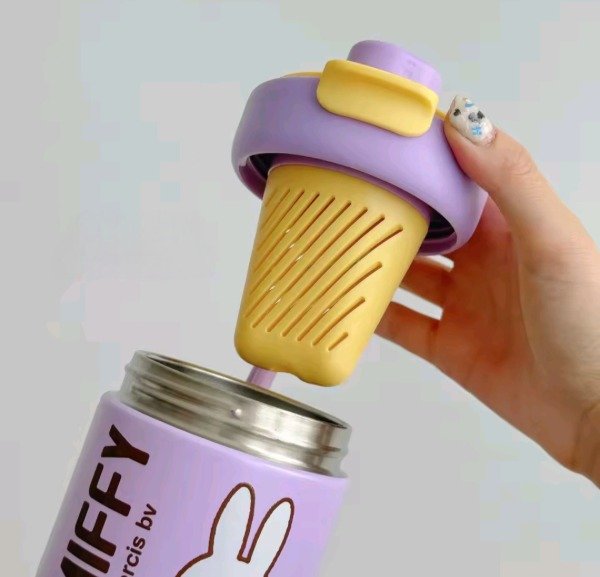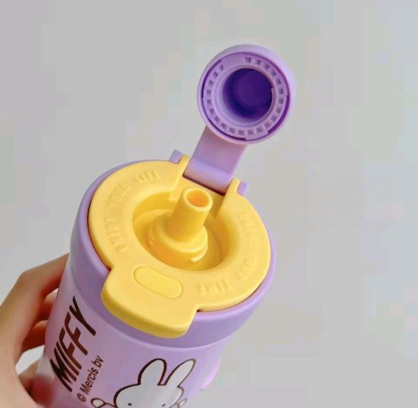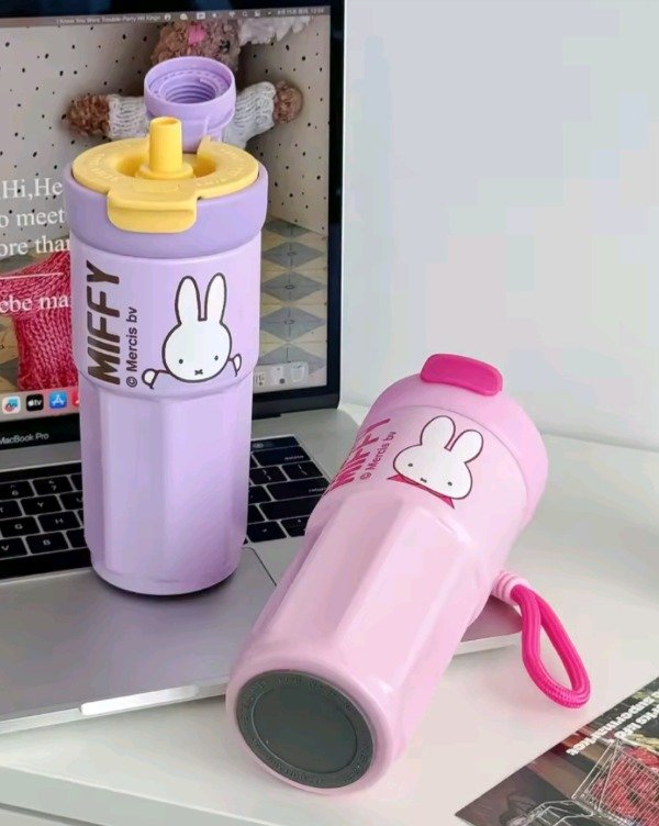 Vaso de acero cute rabbit, con correa para poder trasladarlo con mas facilidad. En la tapa trae un tapón giratorio para colocar el sorbete y pico como para tomar café, té...
