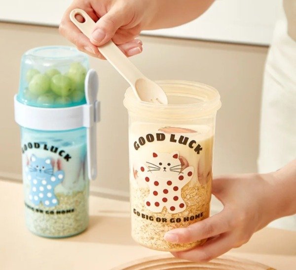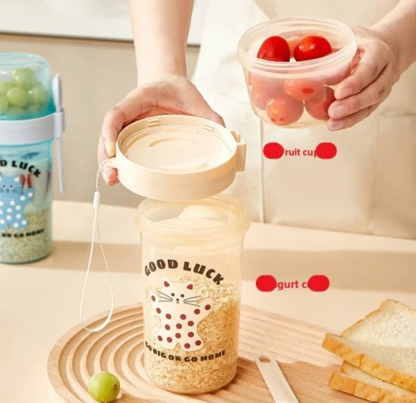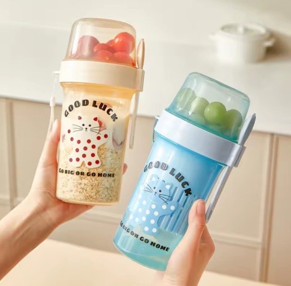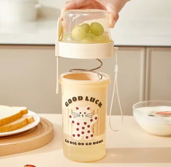 Bow 2 en 1 , trae un bowl grande como para yogur , en la tapa trae un resorte para poder filtrar el agua del yogur con mas rapidez. En la parte superior de la tapa trae un bowl con tapa como para llevr frutas, verduras. Trae un cubierto al tono y tira para poder llevarla colgada en la muñeca. Con sticker de gatito al tono para poder decorarlo.