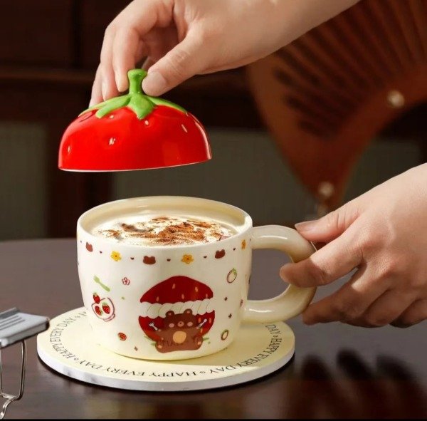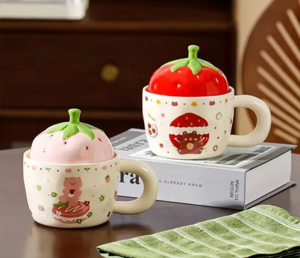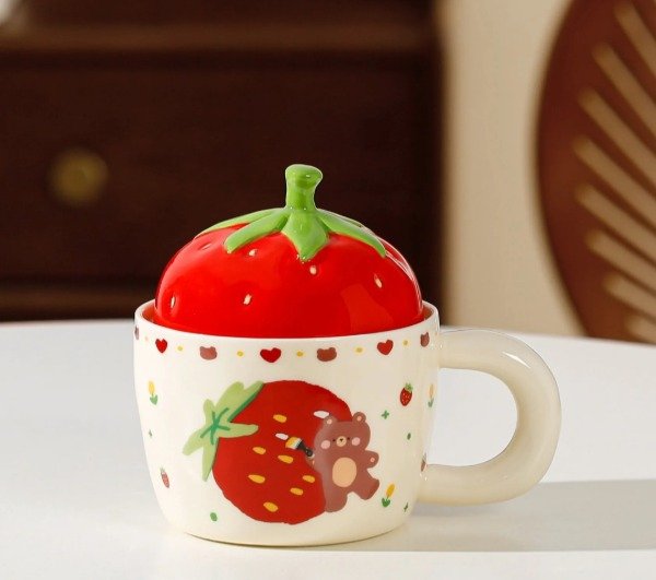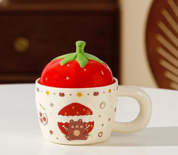 Hermosa taza de cerámica con tapa en forma de frutilla 3D, ideal para quienes aman los detalles tiernos y originales. Su diseño incluye ilustraciones delicadas con motivos de frutillas y ositos, aportando un toque dulce y decorativo a tu cocina o escritorio.