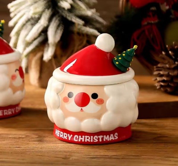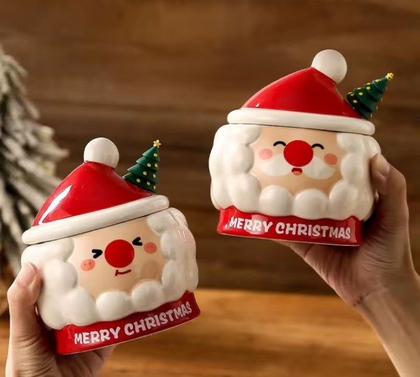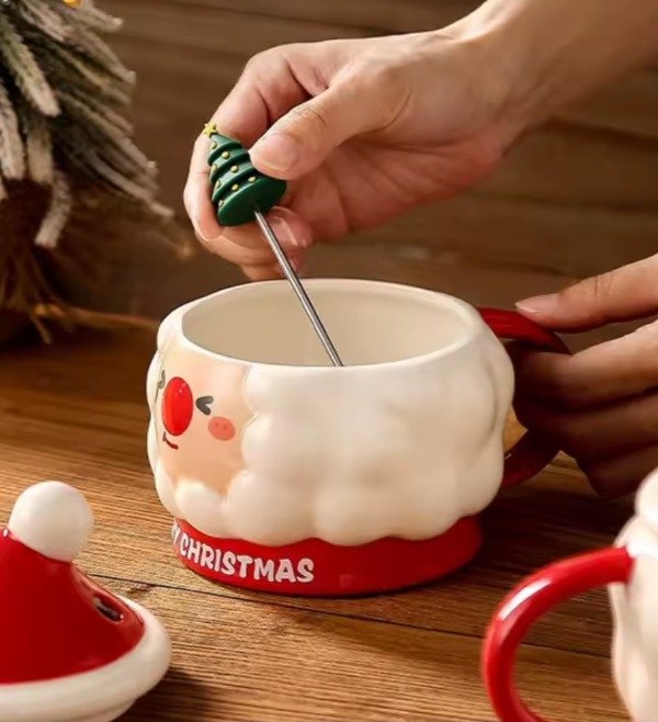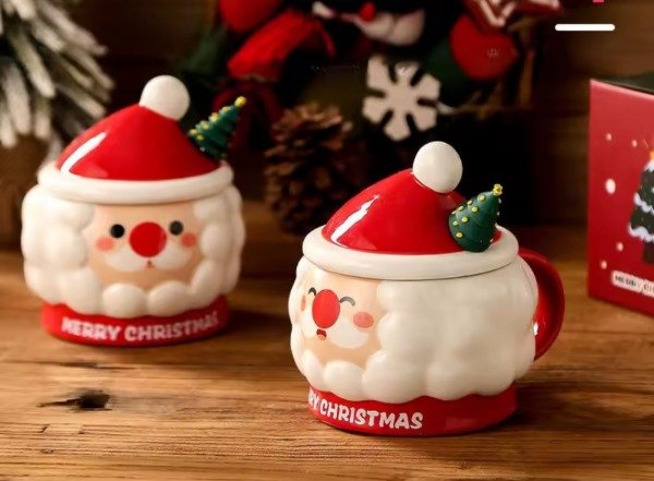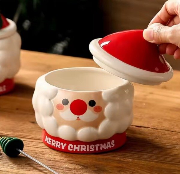 Hermosa taza de cerámica con el rostro de Santa Claus, con hermosos detalles, ideal para darle un toque festivo a tus desayunos, meriendas. Con tapa en forma de gorrito navideño, ideal para mantener la temperatura del café, té o cualquier bebida caliente. También trae revolvedor con aplique de silicona rígida en forma de árbol navideño. Muy tierna ideal para regalar a tus amigos, familiares o regalarte. No son aptas para microondas. 🎅🎅🎄🎄