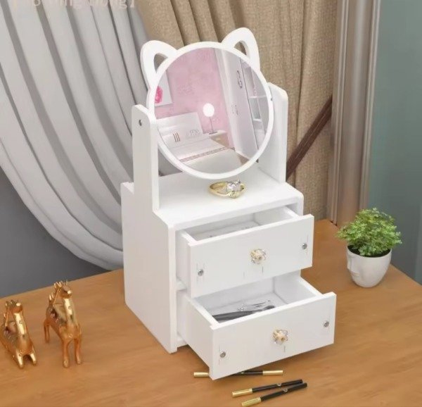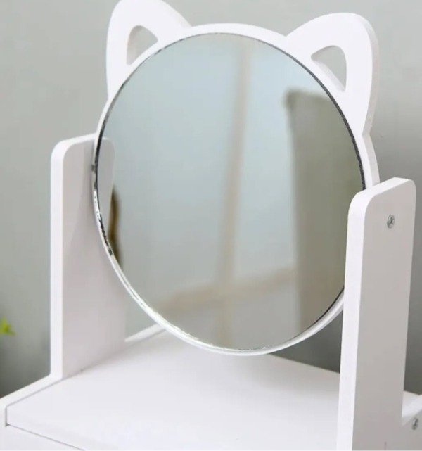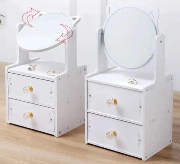 Hermoso Alajero/ organizador de make up gatito 😻❤️. Con espejo con orejas de gatito, giratorio 360 grados. Con dos cajoneras para poder guardar joyas, make up .... Material de PVC , con herrajes con detalles en dorado y cristal. Súper original y muy cute ❣️