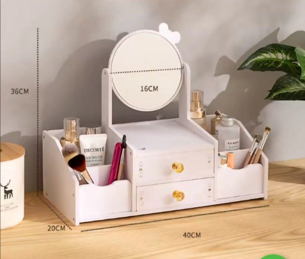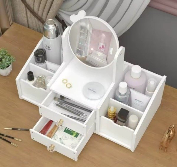 Hermoso Alajero/organizador de make up cutie🥰. Con espejo giratorio y aplique en forma de moño. Con dos cajoneras a ambos lados para guardar make up, joyas...., viene con herrajes con detalles en dorado y cristal. Con un organizador con tres divisiones en uno de los laterales para poder poner cremas , perfumes... Material de PVC. Súper original y muy cute ❤️❤️