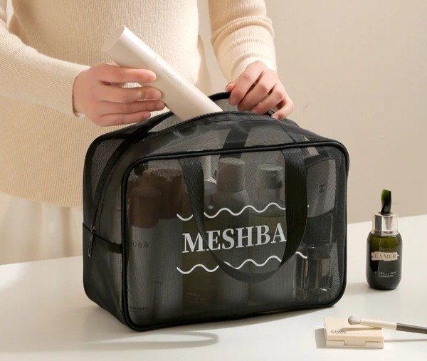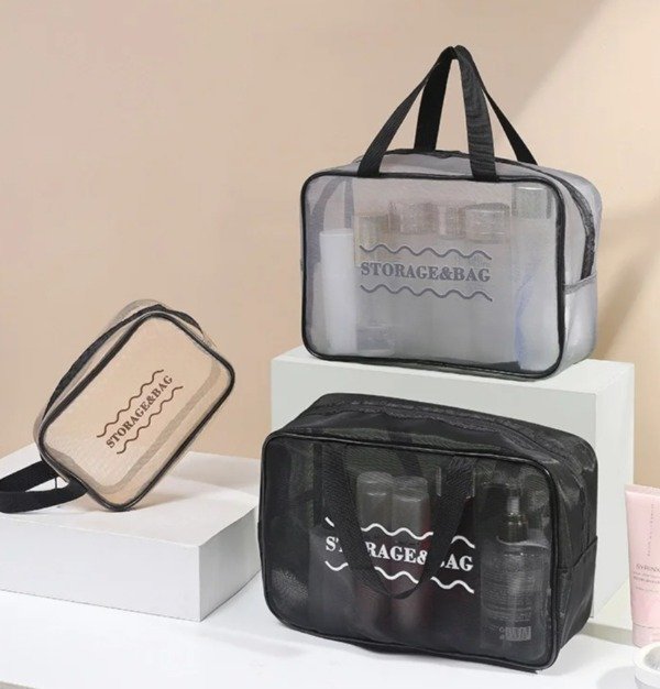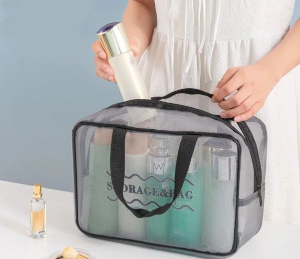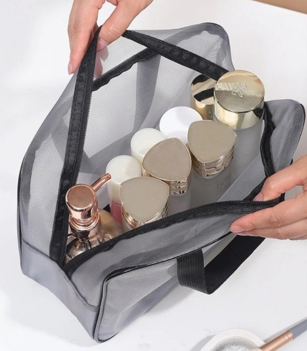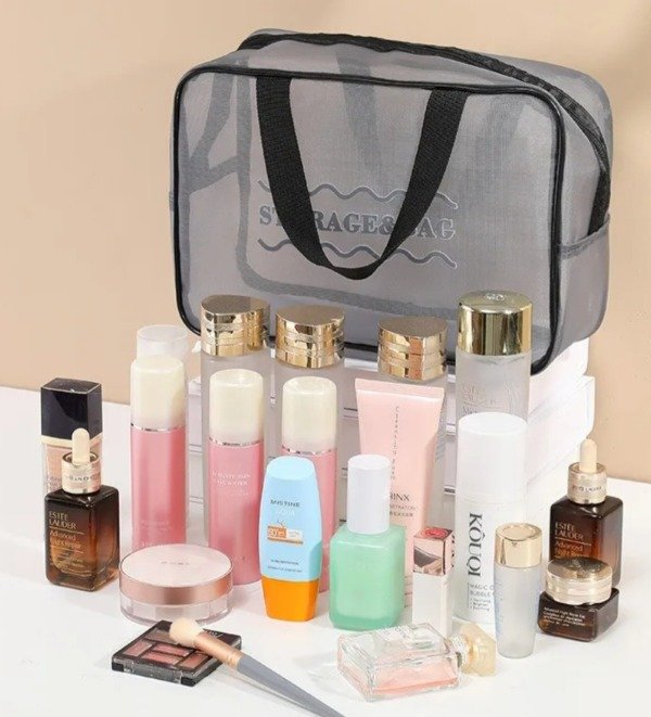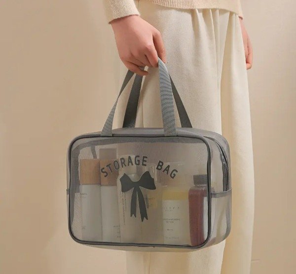 Practico neceser organizador transparente, ideal para llevar productos de higiene personal, maquillaje o accesorios pequeños.
