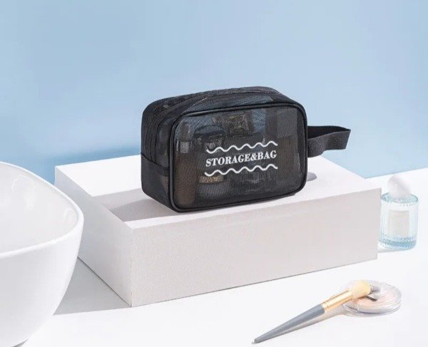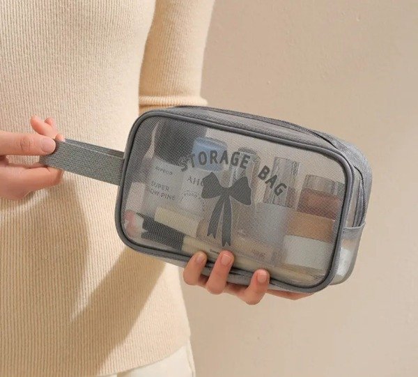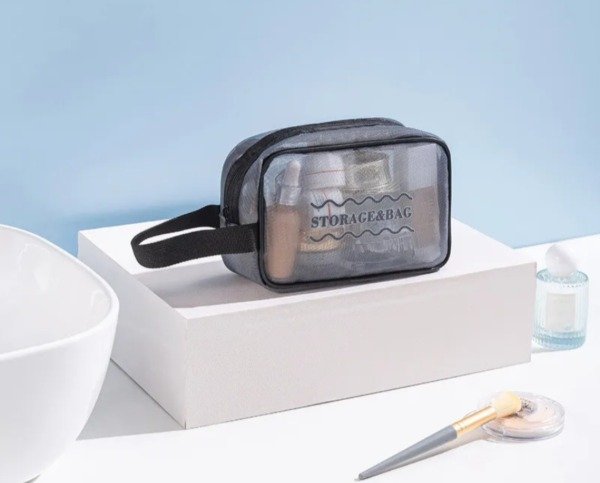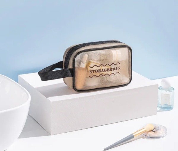 Practico neceser organizador transparente, ideal para llevar productos de higiene personal, maquillaje o accesorios pequeños.
