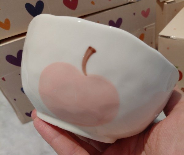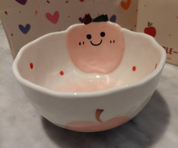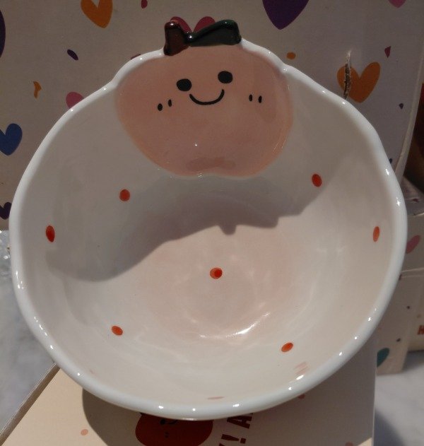 Este adorable bowl de cerámica combina funcionalidad y ternura en una sola pieza. Su diseño incluye una simpática manzanita en relieve con carita sonriente en el interior, aportando un detalle único y encantador.